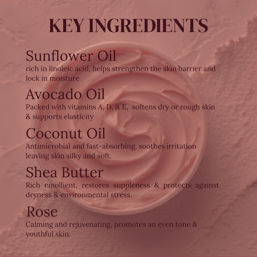 Shea Butter*, Coconut Oil*, Rose-Infused Sunflower Oil*, Avocado Oil*, Arrowroot Powder*, Mica Powder, Natural Paraben & Phthalate-Free Fragrance Oil, Rose Essential Oil, Vitamin E Oil*.