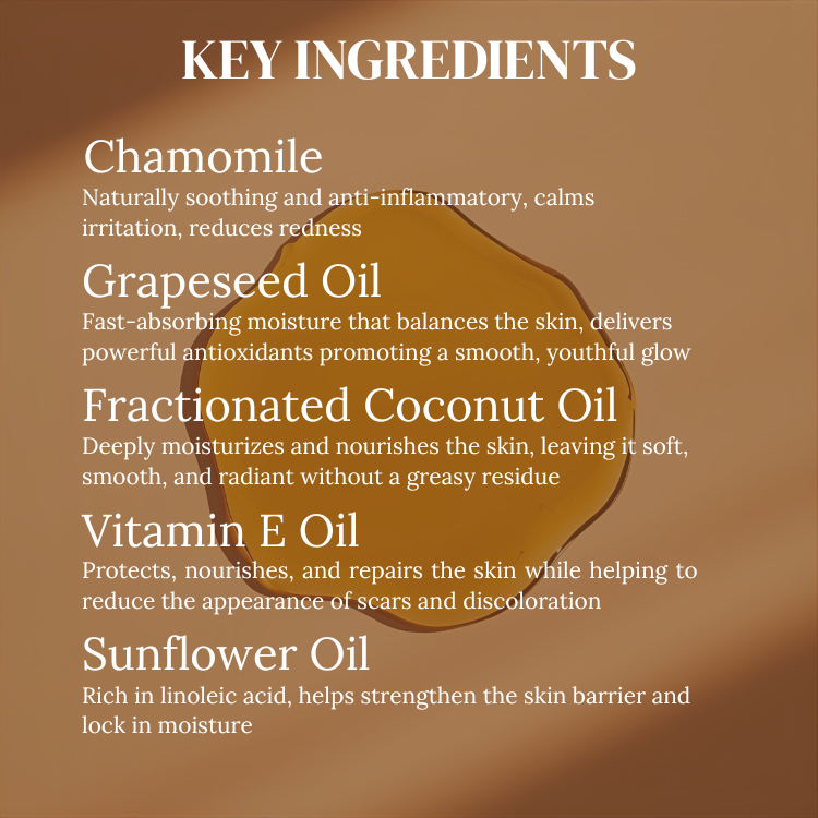 Full Ingredients: Chamomile-Infused Sunflower Oil*, Fractionated Coconut Oil*, Grapeseed Oil*, Vitamin E Oil*, Cardamom Essential Oil, Natural Paraben & Phthalate-Free Fragrance.