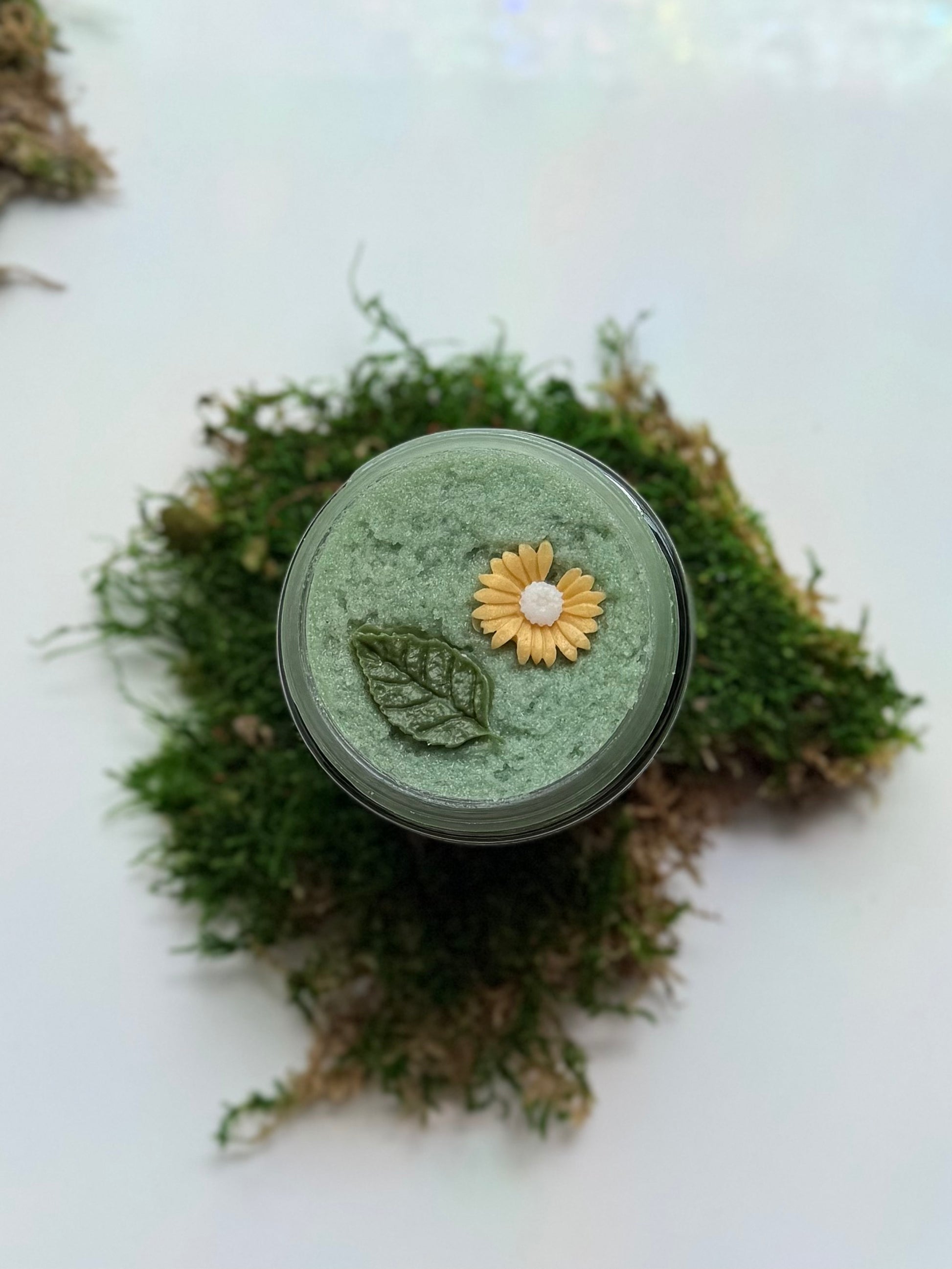 A green, nuanced, floral blend. A medium green colored scrub, naturally tinted with French green clay and organic spirulina powder. Topped with an adorable flower and leaf soap embed, perfect for handwashing or as a single use soap.